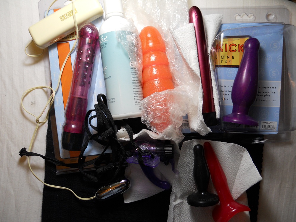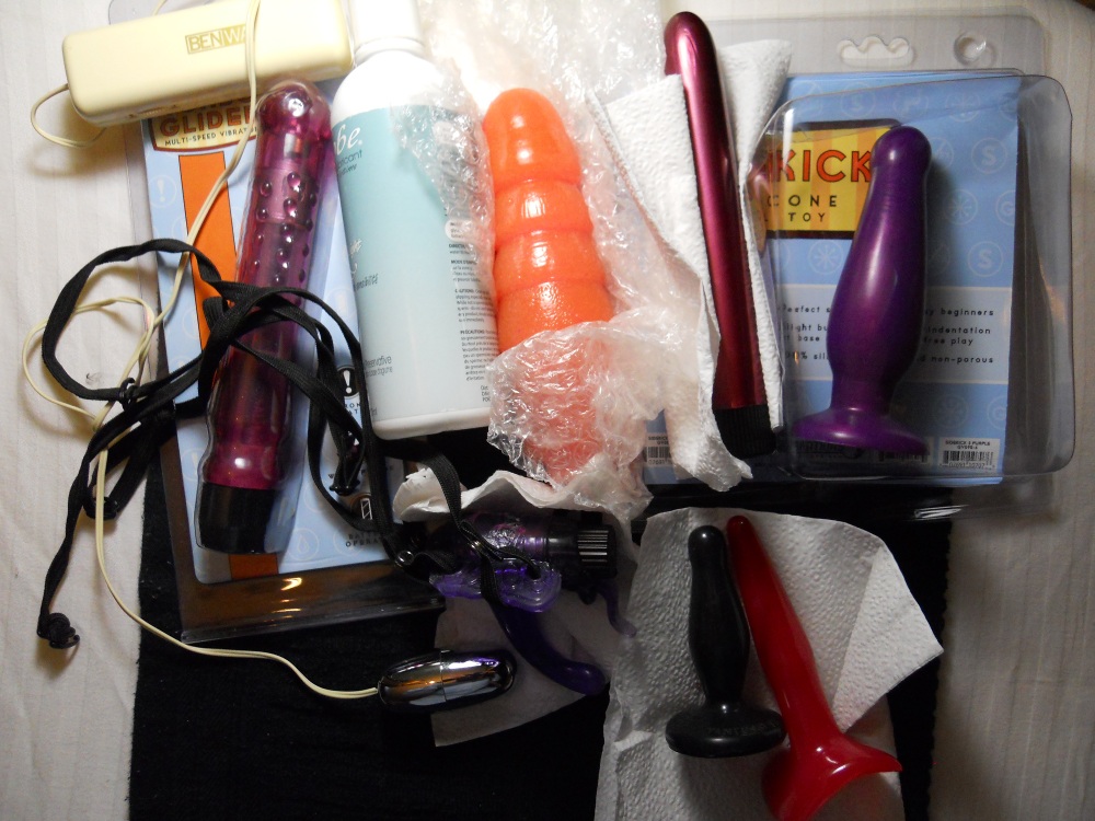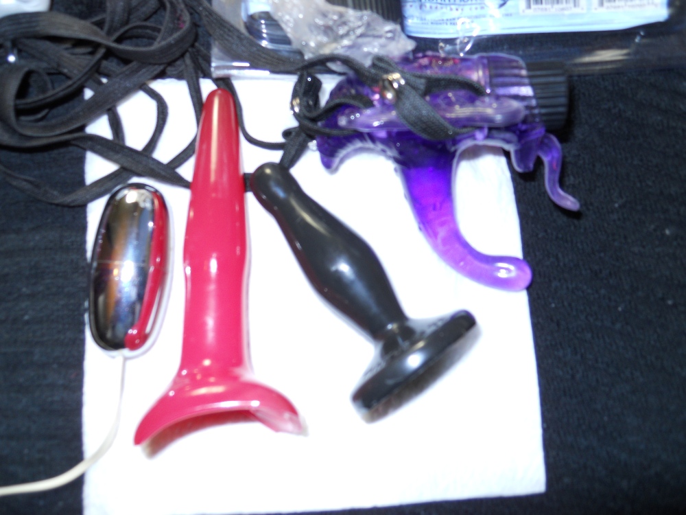 ..a purple wearable or strap-on to vibe your clit (closeup in last pic) and a vibrating egg that goes into a pouch that can be strapped on so similarly vibe your clit, hands-free, leaves your openings and butt available, nice for vanilla or alternating with spanking or other stimulation.